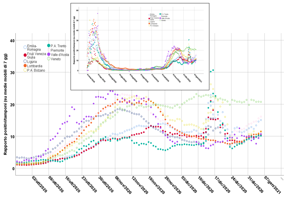 La progressione verso una nuova ondata epidemica è molto evidente e preoccupante in alcune regioni, Piemonte, Liguria, Trentino-Alto Adige, nelle regioni centrali ed in Sicilia, ma comunque molto chiara in tutte le altre regioni. Il Veneto fa storia a sé, perché non ha nemmeno subito il declino seguente al lockdown natalizio, per motivi difficilmente spiegabili. Certo è impossibile non mettere in relazione questa terribile recrudescenza epidemica con le scelte politiche compiute (la dismissione della consulenza fornita da Andrea Crisanti), anche se è impossibile stabilirne un nesso di causalità.