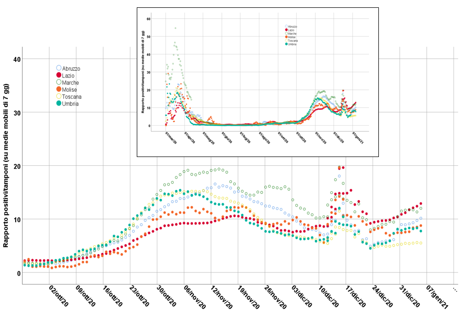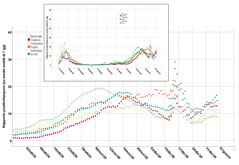 Nelle tre figure che seguono si può facilmente osservare che la progressione in discesa del contagio si è arrestata tra il 12 ed il 24 Dicembre, nei tempi prevedibili sulla base dei decreti che avevano liberalizzato la circolazione pre-natalizia. È molto preoccupante l’evidenza che la curva epidemica ha ripreso a salire chiaramente dopo il Natale, dovunque, anche nelle regioni, come la Campania, che avevano meglio controllato l’epidemia esplosa nelle sue peggiori forme tra l’inizio di ottobre e la prima decade di novembre.